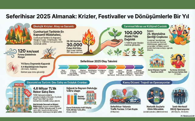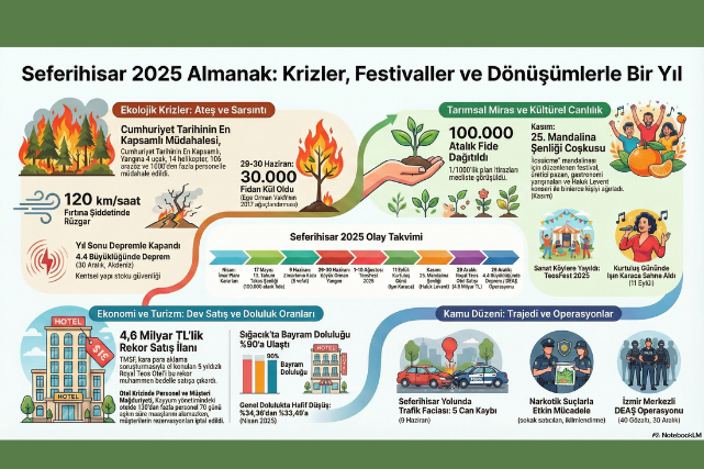 Sakin Şehir (Cittaslow) başkentimiz Seferihisar, 2025 yılını tarihe geçecek olaylarla geride bıraktı. Bir yanda ciğerlerimizi dağlayan alevler ve yüreğimizi yakan kayıplar, diğer yanda toprağa sahip çıkan festivaller ve milyarlık ekonomik çalkantılar… Seferihisar Life ekibi olarak, ilçemizin hafızasına kazınan 2025 yılının en kritik olaylarını, perde arkası detaylarıyla sizin için derledik.
