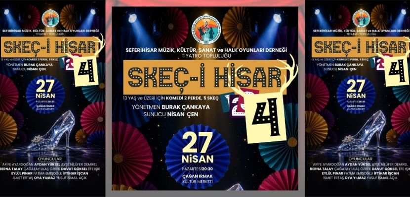 Seferihisar’da sahne heyecanı: Skeç-i Hisar 4 geliyorSeferihisar Tiyatro Topluluğu’nun “Skeç-i Hisar 4” oyunu, 27 Nisan Pazartesi günü saat 20:30’da Çağan Irmak Kültür Merkezi’nde izleyiciyle buluşacak. -